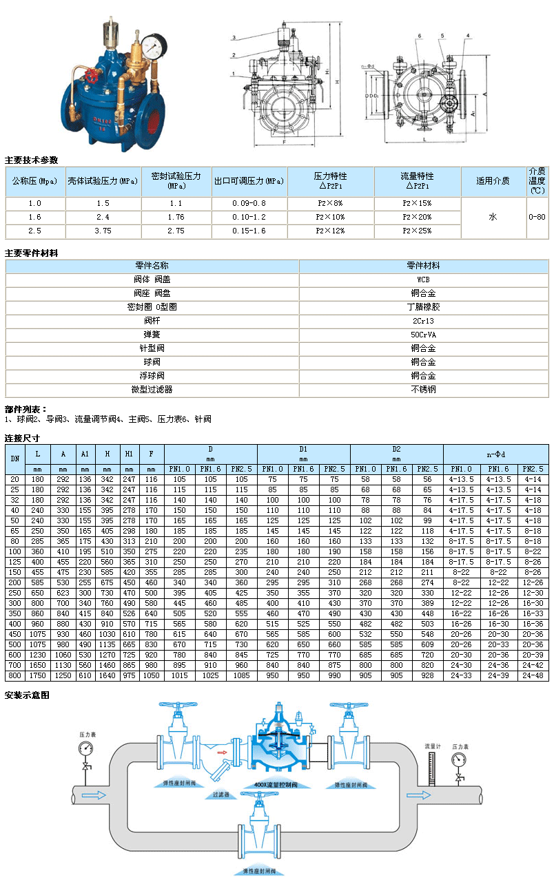 400X流量控制閥由主閥、流量調(diào)節(jié)閥、針閥、導(dǎo)閥、球閥、微形過濾器和壓力表組成水力控制接管系統(tǒng)。利用水力自動操作,控制和調(diào)節(jié)主閥開度,使通過主閥的流量保持不變。本產(chǎn)品利用水力自力控制,不需要其它裝置和能源,保養(yǎng)簡便,流量控制穩(wěn)定。本系列閥門產(chǎn)品廣泛用于高層建筑、生活區(qū)等供水管網(wǎng)系統(tǒng)及城市供水工程。當(dāng)閥門從進口端給水時,水流過針閥進入主閥控制室,并經(jīng)過導(dǎo)閥、球閥流出主閥控制室到出口,此時主閥處于全開或浮動狀態(tài)。調(diào)定主閥上部的流量調(diào)節(jié)閥,可為主閥設(shè)定一定開度。調(diào)節(jié)針閥開度和調(diào)節(jié)導(dǎo)閥彈簧壓力,即可使主閥開度保持在設(shè)定開度,并在壓力變化時導(dǎo)閥進行自動調(diào)節(jié),保持流量不變。 |