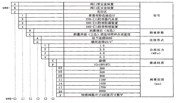 4、測(cè)量范圍L:測(cè)量范圍按中心距離而制定:300、500、800、1100、1400、1700、2000mm鍋爐水位計(jì);300、350、440mm,特殊規(guī)格請(qǐng)注明尺寸
