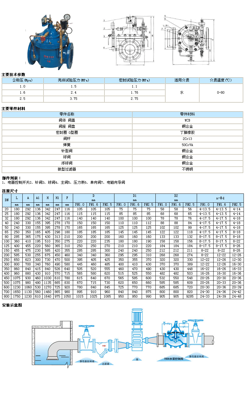 700X多功能水泵控制閥由主閥、電磁導(dǎo)閥、針閥、球閥、單向閥、行程開關(guān)、微形過濾器和壓力表組成水力控制接管系統(tǒng)。水泵需停止工作時,先由進(jìn)口壓使主閥關(guān)閉90%后,水泵停止運轉(zhuǎn)。剩余10%由回水關(guān)閉。可防止水錘現(xiàn)象發(fā)生。本產(chǎn)品利用電磁導(dǎo)閥控制,不需要其它裝置和能源。節(jié)約能源,保養(yǎng)簡便,停泵平穩(wěn)。電磁閥可采用交流電220V或直流電24V。本系列閥門產(chǎn)品廣泛用于高層建筑、生活區(qū)等供水管網(wǎng)系統(tǒng)及城市供水工程。當(dāng)水泵工作閥門向下游供水時,電磁導(dǎo)閥全開,針閥調(diào)至適當(dāng)開度,上游水經(jīng)針閥、單向閥進(jìn)入主閥控制室,經(jīng)電磁導(dǎo)閥流出,此時主閥控制室的壓力保持主閥處于合適的開度,保持下游正常供水。當(dāng)水泵停止工作時,電磁導(dǎo)閥先關(guān)閉,主閥控制室停止排水,控制室壓力升高,主閥開始關(guān)閉。當(dāng)關(guān)閉至90%時,主閥上部行程開關(guān)輸出停泵信號,水泵停止運轉(zhuǎn)。此時下游回水經(jīng)單向閥進(jìn)入主閥控制室,控制室壓力升高,主閥被關(guān)閉。 |