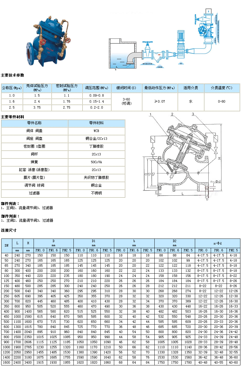 本產(chǎn)品由主閥和調(diào)節(jié)閥及接管系統(tǒng)組成,閥體采用直流式閥體,主閥控制室為膜片式或活塞式的雙控制室結(jié)構(gòu),控制室比一般水力控制閥增加了一個,增加了對主閥的控制功能,實(shí)現(xiàn)了對水泵出口的緩慢開啟、全開、緩閉、截止等多功能控制,實(shí)現(xiàn)了一個閥門、一次調(diào)節(jié)對水泵出口的多功能控制。